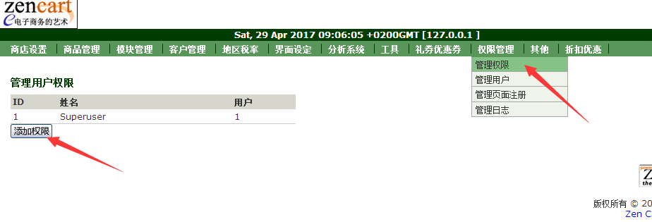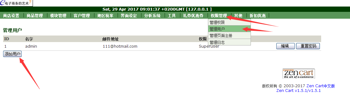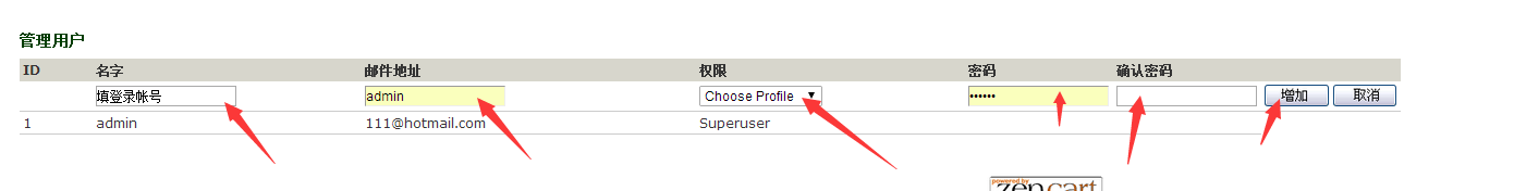 首先用管理员帐号登录后台-》管理权限-》管理用户 添加用户