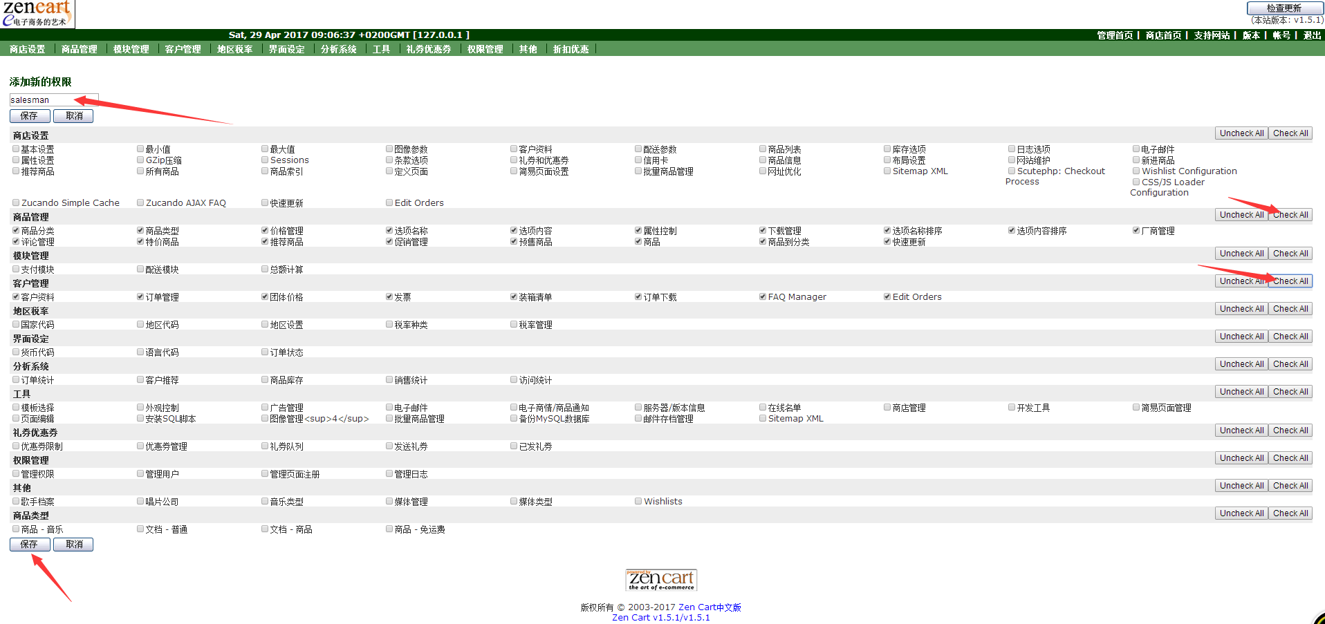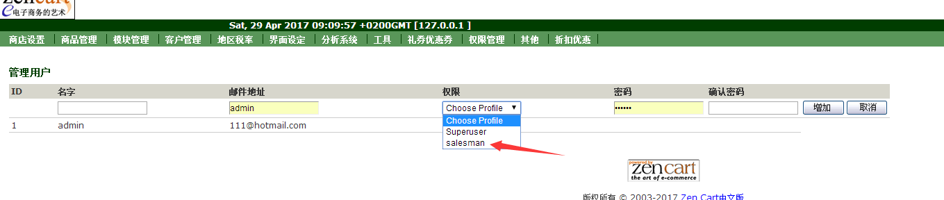 接下来添加管理用户时可以有业务员权限可以选择!